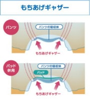 ●脚回りまで包み込む丈の長さは横モレに強くで安心。更に、もちあげギャザー(特許取得)が吸収体を身体に密着。隙間をつくりません。